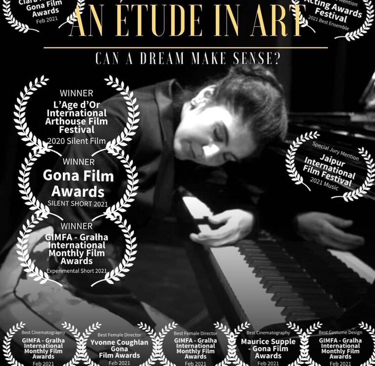 An Étude in Art had its world premiere at the 14th Waterford Film Festival, 20-23 November 2020. Our first award was in 2020, when we received a Special Jury Mention in a music category at the 13th Jaipur International Film Festival, Honorable Mention for Best Ensemble Acting in a short film at The Acting Awards- January, 2021 (Los Angeles) Certificate of Excellence as a finalist in Beyond the Curve International Film Festival December 24, 2020 (France)